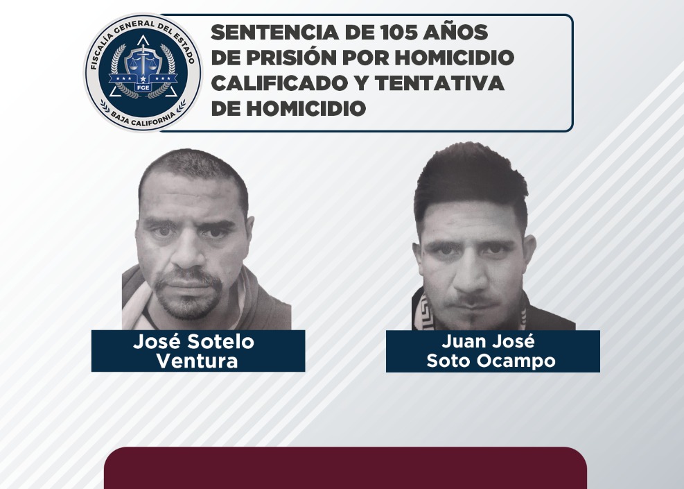 La Fiscalía General del Estado logró una sentencia histórica y ejemplar de 105 años de prisión para dos imputados, quienes fueron encontrados responsables de la comisión de los delitos de homicidio calificado por ventaja y homicidio calificado en su grado de ejecución de tentativa.