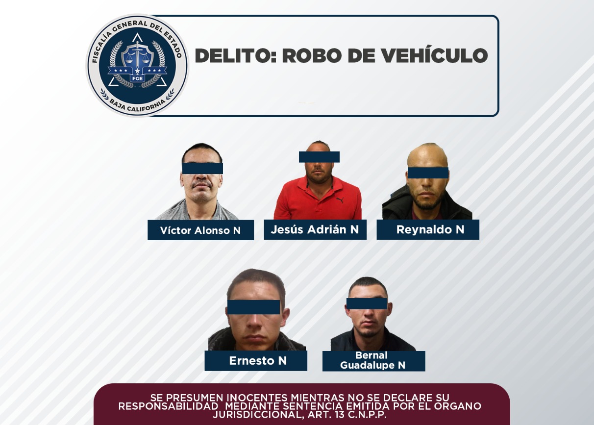 Fueron llevados ante la justicia los de nombre Jesús Adrián “N”, Reynaldo “N” y Bernal Guadalupe “N”, los tres por el delito de robo equiparado de vehículo de motor en su modalidad de uso de vehículo robado.