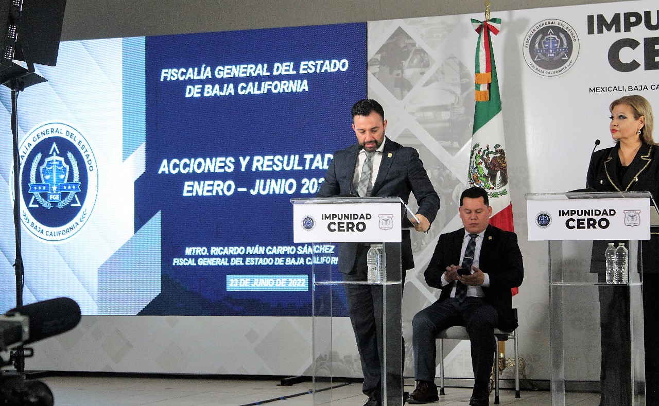 Durante la conferencia semanal Impunidad Cero, efectuada en la capital del Estado, el Fiscal General de Baja California, Ricardo Iván Carpio Sánchez dio a conocer los avances en las investigaciones de casos que nos llegan a través de las denuncias; la métrica en los delitos, que en su mayoría van en decremento,