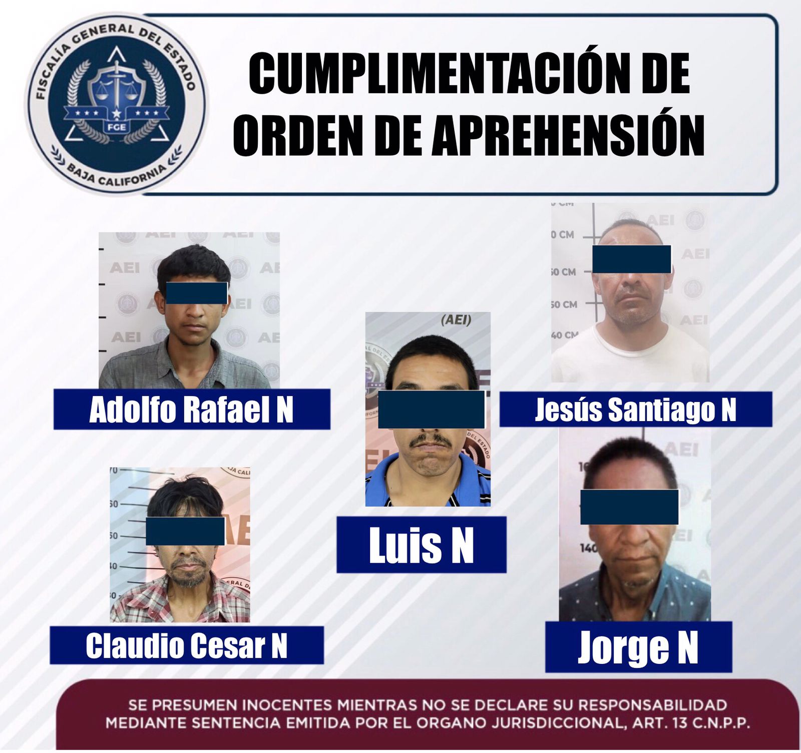 La Fiscalía Regional de Mexicali a través de las acciones realizadas por la Agencia Estatal de Investigación, logró la cumplimentación de cinco órdenes de aprehensión a igual número de personas, por casos distintos.