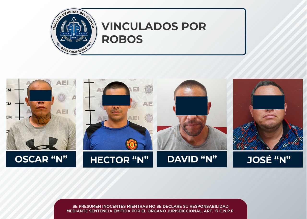 Cuatro personas relacionadas en robos con violencia cometidos a establecimientos comerciales y a casa habitación ubicados en la zona poniente, fueron vinculados a proceso con la medida cautelar de prisión preventiva, con base a las pruebas presentadas por la Fiscalía Regional de Mexicali.