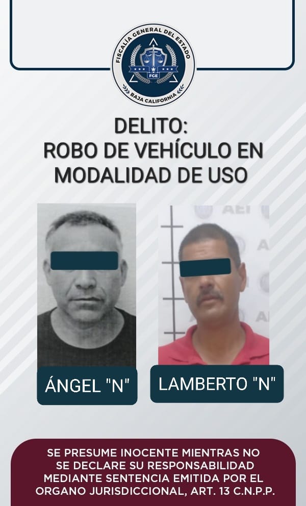 La Fiscalía Regional de Ensenada logró la vinculación a proceso de dos hombres, uno de ellos detenido en flagrancia y otro capturado por orden de aprehensión, por el delito de robo de vehículo en modalidad de uso.