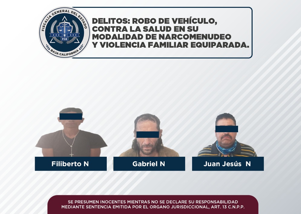 La Fiscalía Regional de Tecate, a través de la Agencia Estatal de Investigación, capturó a tres sujetos que contaban con órdenes de aprehensión en su contra por los delitos de robo equiparado de vehículo, contra la salud en su modalidad de narcomenudeo y violencia familiar equiparada.