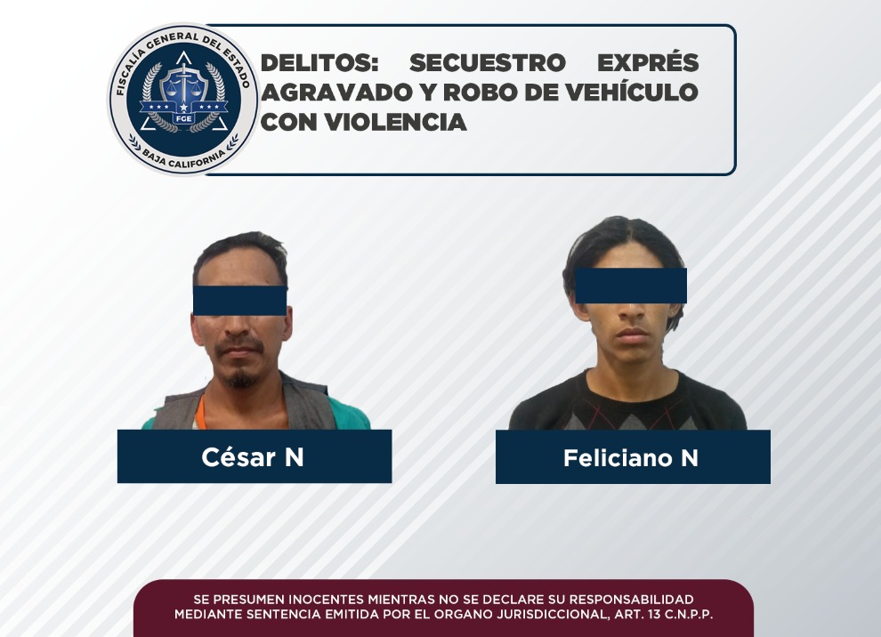 La Fiscalía Regional de Tijuana, a través de los medios de prueba presentados por el Ministerio Público, logró que fueran vinculados a proceso penal dos sujetos por los delitos de secuestro exprés agravado y robo de vehículo de motor ejecutado con violencia.