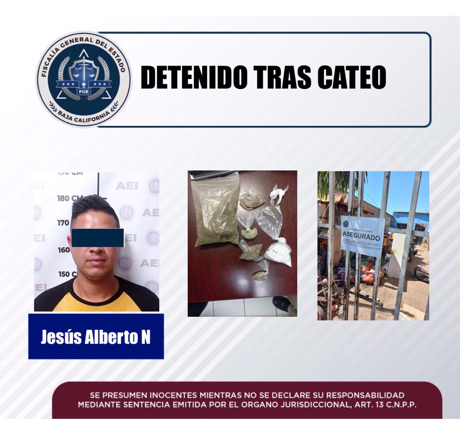 La Fiscalía General del Estado a través de las acciones de la Fiscalía Especializada en Narcomenudeo, en seguimiento a la investigación de denuncias anónimas, ejecutó un cateo, logrando asegurar a Jesús Alberto “N”, de 32 años de edad, quien dijo ser hijo del morador del domicilio.