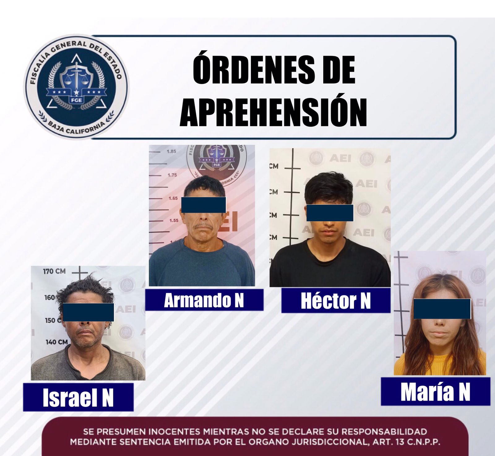 La Fiscalía Regional de Mexicali a través de las acciones realizadas por la Agencia Estatal de Investigación, logró la cumplimentación de cuatro órdenes de aprehensión a igual número de personas, por casos distintos.
