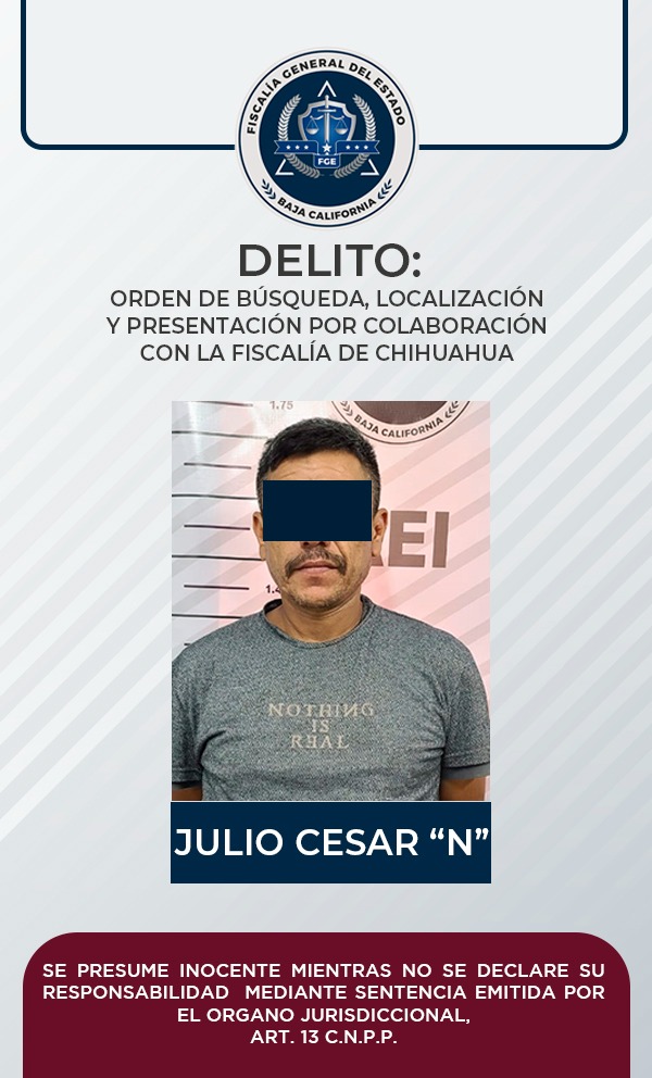 Una vez concluidos los trámites correspondientes, Julio Cesar “N” fue entregado a los agentes investigadores de Chihuahua, quienes lo trasladaron a esa entidad para su presentación ante la autoridad que lo requiere.