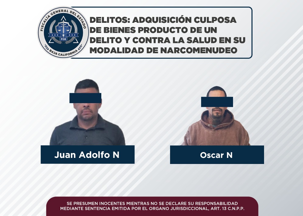 Como resultado del trabajo efectuado por los agentes investigadores adscritos a la Fiscalía Regional de Tecate, se logró aprehender a dos individuos, en hechos distintos, por ser probables responsables en los delitos de adquisición culposa de bienes productos de un delito y contra la salud en su modalidad de narcomenudeo.
