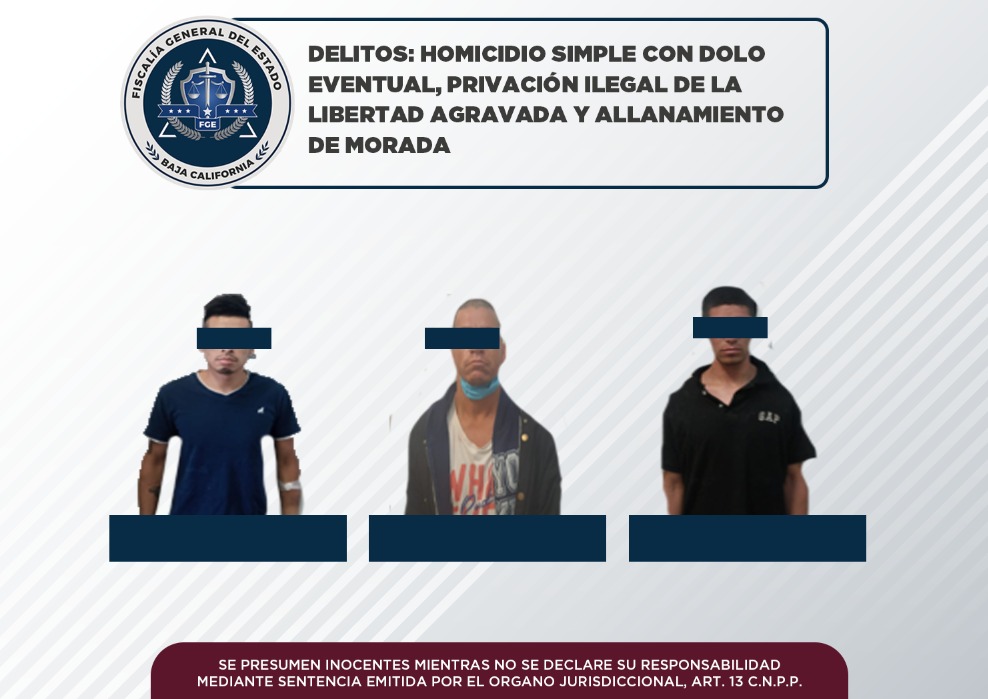 Una vez presentados los elementos de prueba, la Fiscalía Regional de Tijuana, obtuvo la vinculación a proceso de tres individuos, por su probable participación en los delitos de homicidio simple con dolo eventual, privación ilegal de la libertad agravada y allanamiento de morada.