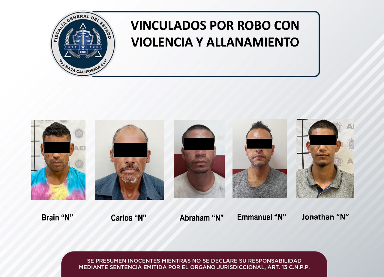 La Fiscalía Regional de Mexicali logró la vinculación a proceso en contra de cinco imputados por los delitos de robo con violencia y allanamiento mediante audiencias por separado.