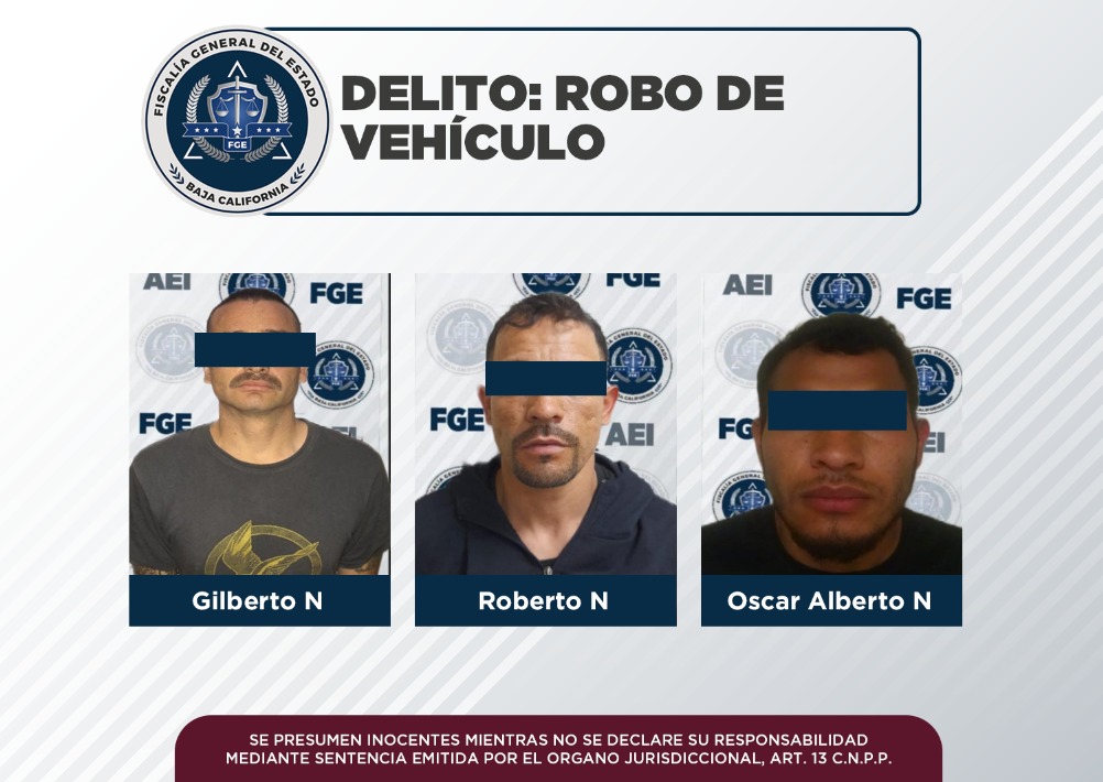 La Fiscalía Regional de Tijuana, a través de elementos de la Agencia Estatal de Investigación (AEI) adscritos al grupo de Aprehensiones, logró la captura de tres sujetos prófugos de la justicia por el delito de robo de vehículo.