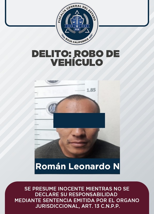 La Fiscalía Regional de Playas de Rosarito, obtuvo la vinculación a proceso de Román Leonardo N, acusado de su probable comisión en el delito de robo de vehículo, en un hecho suscitado el pasado 13 de julio.