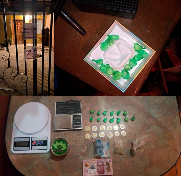 Mientras que en el cateo realizado en una vivienda ubicada en calle Villa Encantada de la colonia Villas de la República, en donde se confiscaron catorce envoltorios de plástico y una bolsa con metanfetamina.