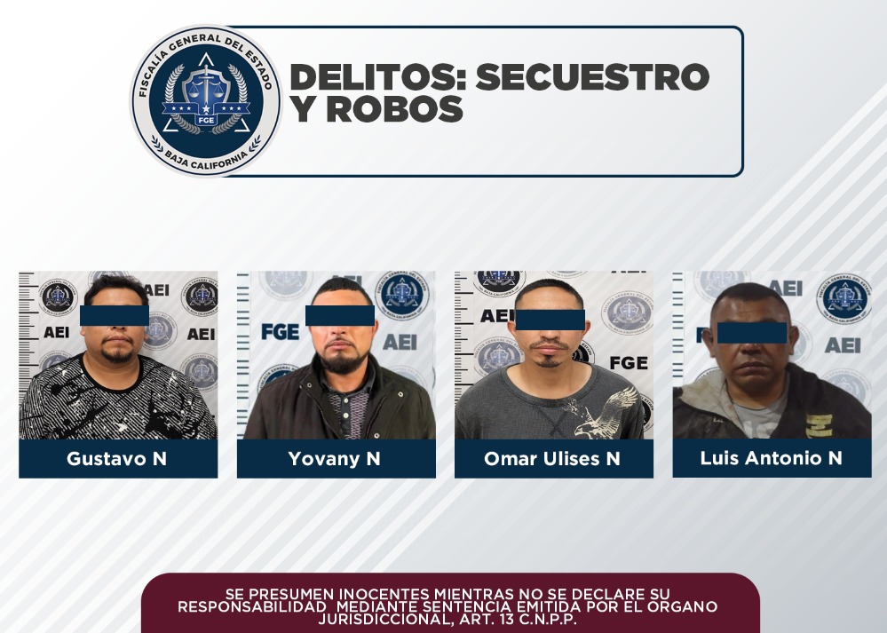 Por otro lado, en acciones distintas, elementos de la AEI, Zona Tijuana, cumplimentaron órdenes de aprehensión a: Yovany N, por robo con violencia calificado; Luis Antonio N, por robo calificado a comercio abierto al público, así como Omar Ulises N, por robo calificado ejecutado con violencia (a un establecimiento abierto al público); todos, fueron remitidos a la autoridad judicial que ordenó su captura y continuar así con las investigaciones.