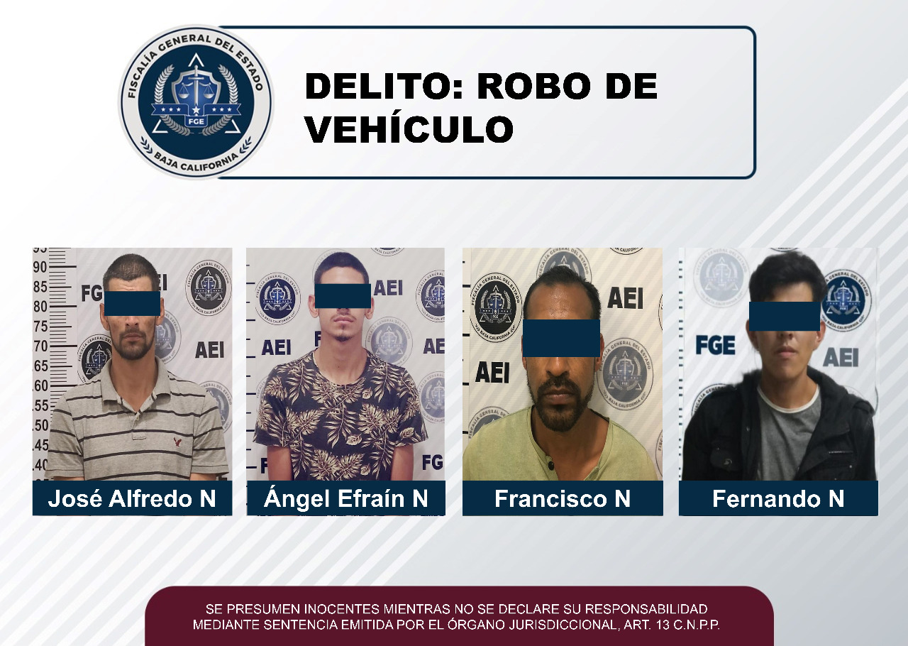 El Grupo de Aprehensiones, Zona Tijuana, detuvo en la colonia Altiplano al de nombre José Alfredo N, por su probable comisión en el ilícito en mención, en las siguientes modalidades: Sustraer partes de vehículo de motor, desmantelar vehículo de motor y usar vehículo de motor.