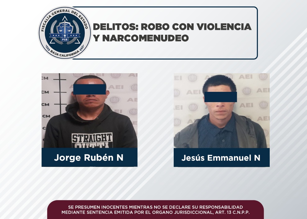 Elementos de la Agencia Estatal de Investigación (AEI), pertenecientes a la Fiscalía Regional de Tecate, cumplimentaron dos órdenes de aprehensión por los delitos de robo con violencia y contra la salud en su modalidad de narcomenudeo.