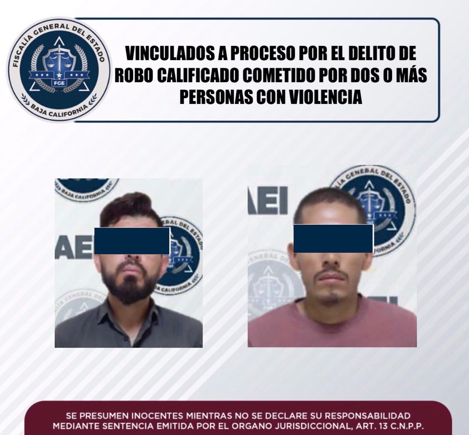 La Fiscalía Regional de Mexicali, a través de la Unidad de Investigación de Robos Oriente, logró la vinculación a proceso dos sujetos por el delito de robo calificado cometido por dos o más personas con violencia.
