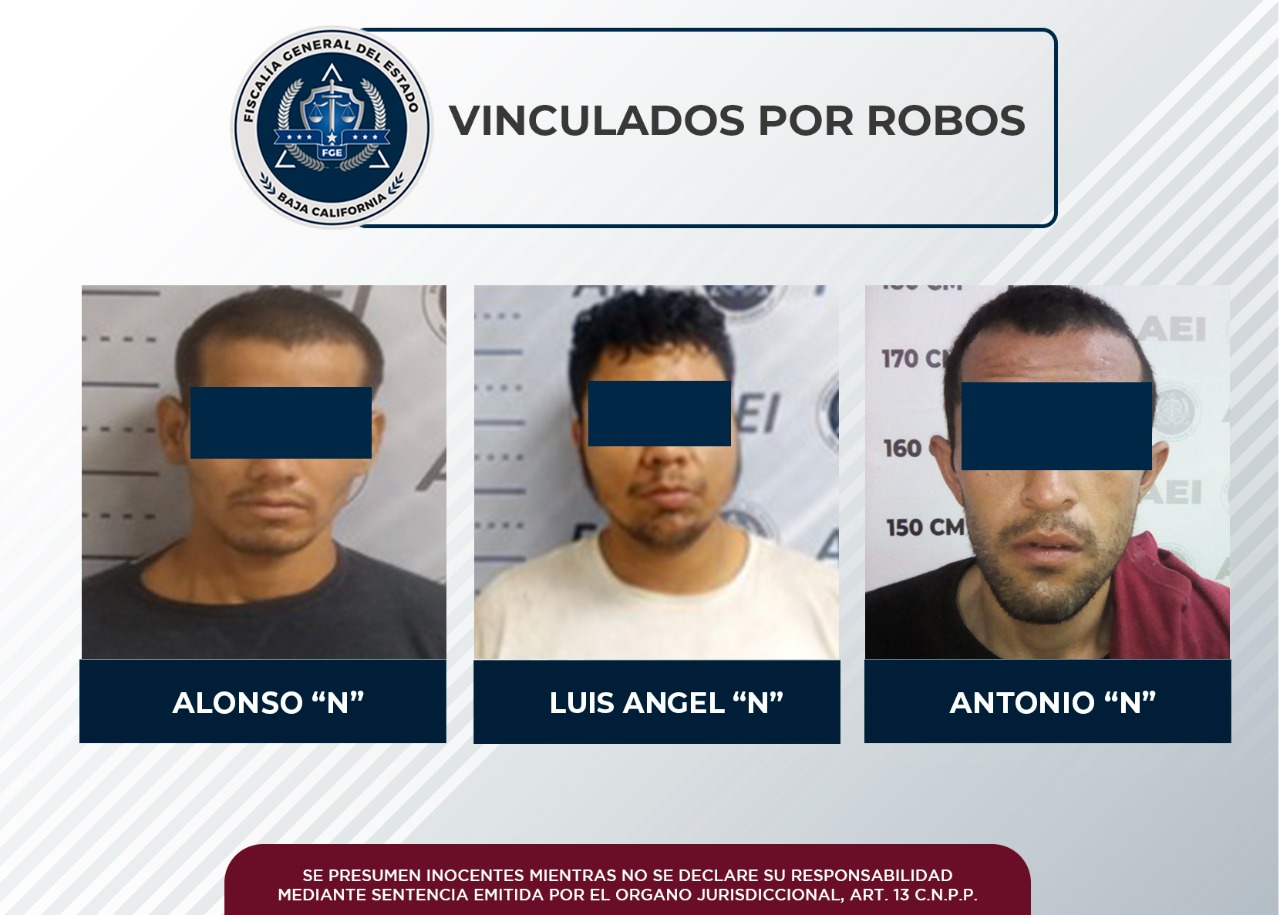 Tres personas relacionadas en robos con violencia, fueron vinculados a proceso con la medida cautelar de prisión preventiva, con base a las pruebas aportadas por la Fiscalía Regional de Mexicali, a través de las Unidades de Investigación de Delitos de Robos Poniente y con Detenidos Oriente.