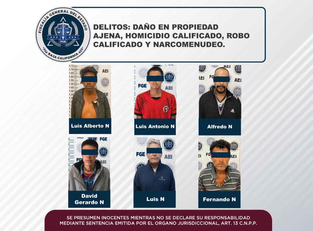 La Fiscalía Regional de Tijuana, a través de Agentes Estatales de Investigación (AEI) adscritos al grupo de aprehensiones, logró la captura de seis personas que contaban con mandatos judiciales vigentes en su contra.