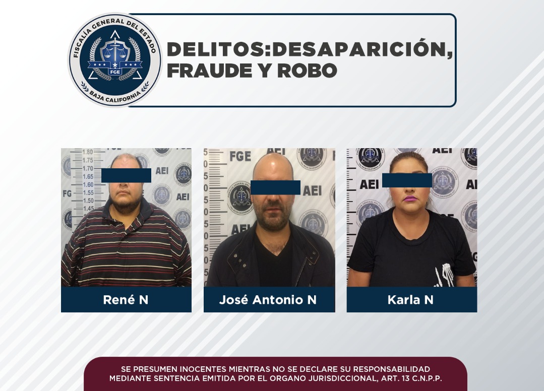 Mediante acciones de colaboración interinstitucional, la Fiscalía General del Estado de Baja California, logró la cumplimentación de tres órdenes de aprehensión a dos hombres y una mujer que contaban con mandatos judiciales pendientes en otras entidades del país.