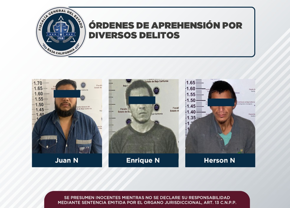 Por diversos delitos, la FGE cumplimenta tres órdenes de aprehensión en Playas De Rosarito