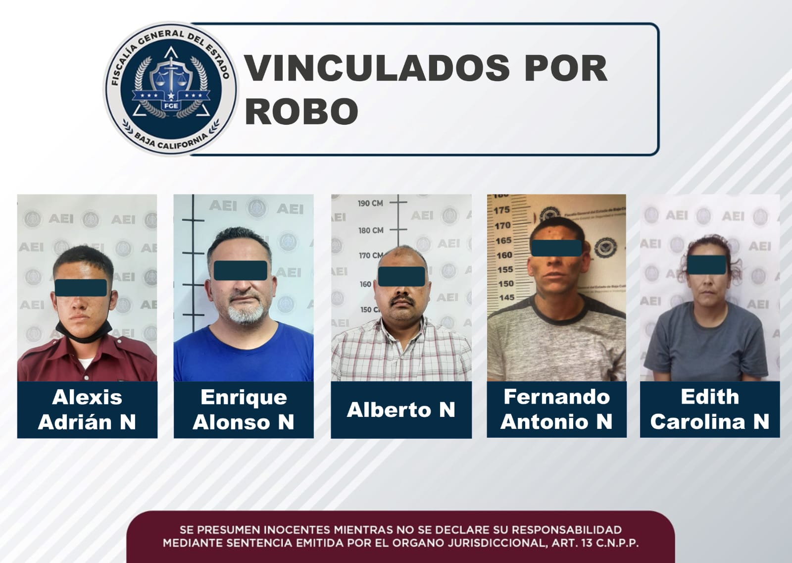La Fiscalía General del Estado obtuvo, en casos por separado, auto de vinculación a proceso y medida cautelar de prisión preventiva contra cuatro hombres y una mujer que habrían cometido robo en la ciudad de Ensenada.