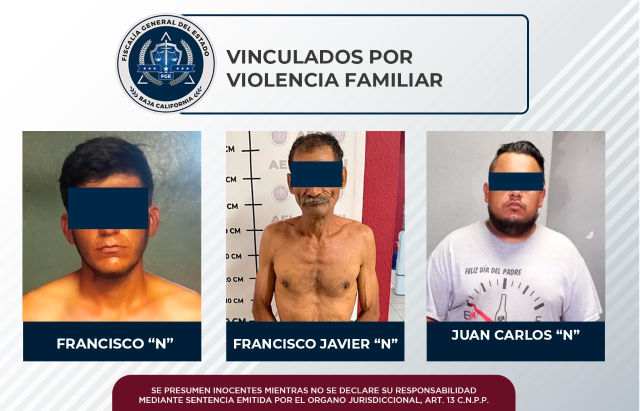 Tres hombres acusados de agredir a sus familiares, fueron vinculados a proceso por la Fiscalía Regional de Mexicali, a través de las Unidades de Investigación Foráneas de Ciudad Morelos, Guadalupe Victoria y San Felipe.