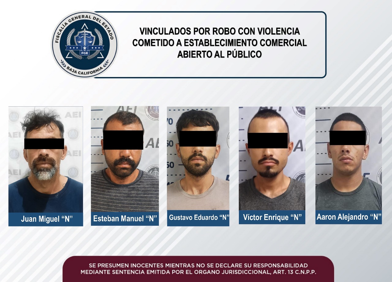 La Fiscalía Regional de Mexicali, a través de la Unidad de Investigación de delitos de Robo Poniente, obtuvo la vinculación a proceso de cinco sujetos acusados de robo con violencia, en audiencias por separado.