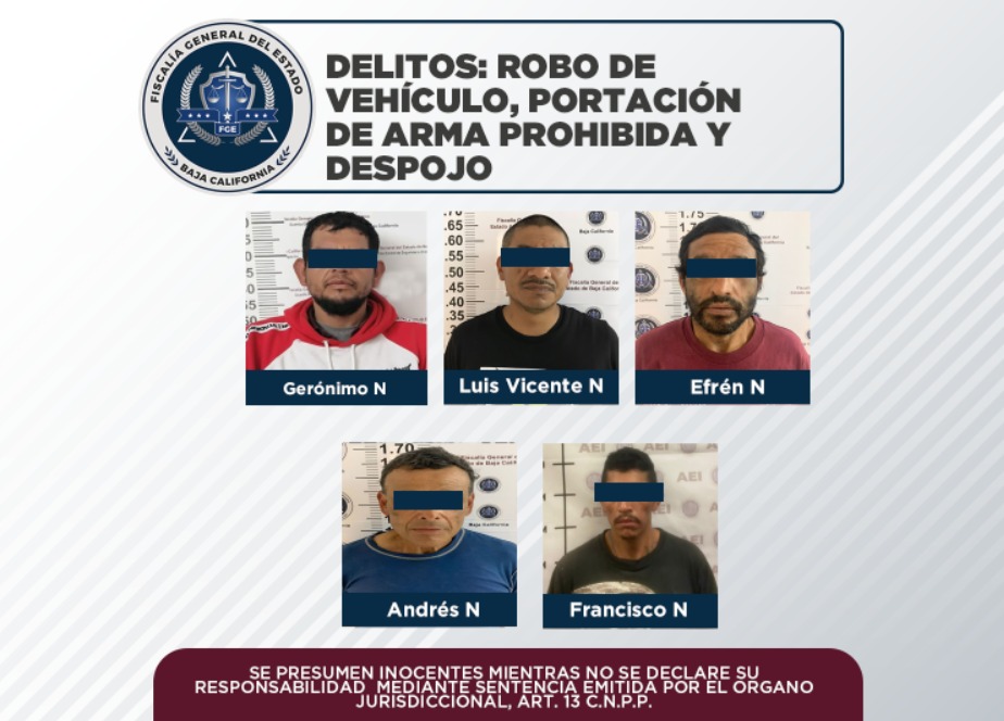 En todos los casos se trata de hombres, quienes fueron capturados por elementos del grupo de aprehensiones adscritos a la Zona Playas de Rosarito, por su probable comisión en los delitos de robo de vehículo, despojo y portación de arma prohibida.