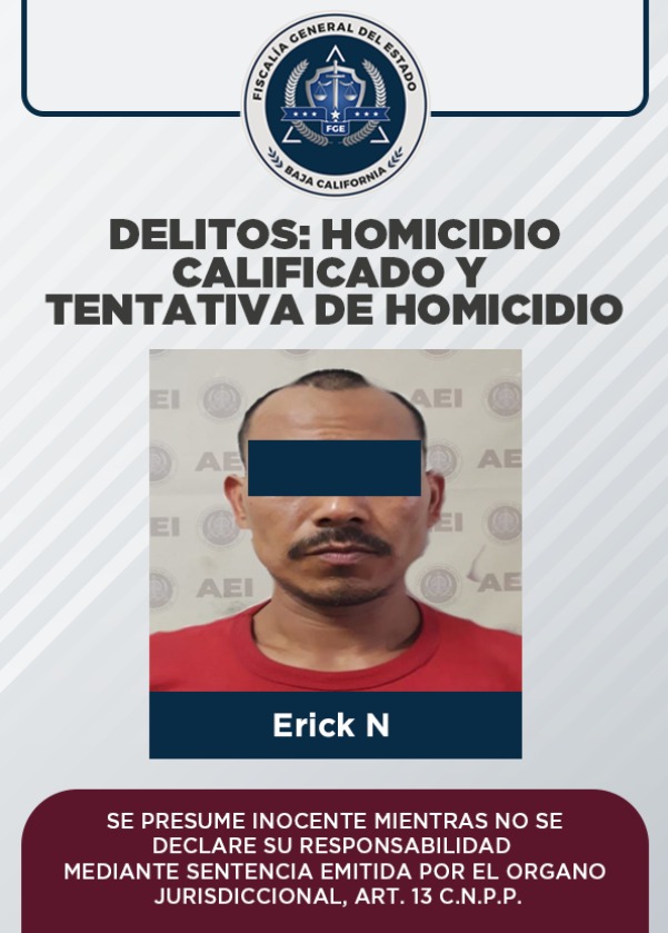 La Fiscalía General del Estado, a través de elementos de la Agencia Estatal de Investigación (AEI), cumplimentó una orden de aprehensión en contra de Erick “N”, por los delitos homicidio calificado con alevosía y ventaja, así como homicidio calificado en grado de tentativa, en agravio de dos agentes de la Policía Municipal de Tecate.