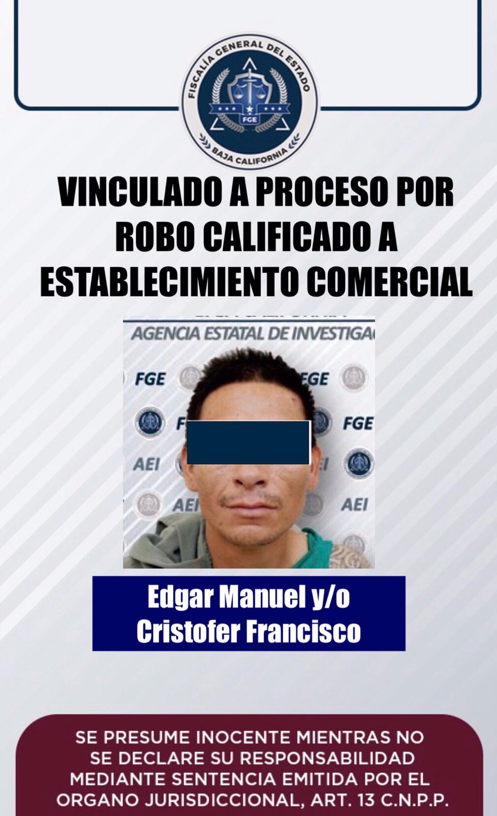 La Fiscalía Regional de Mexicali, a través de la Unidad de Investigación de delitos de Robo Poniente, logró la vinculación a proceso de Edgar Manuel y/o Edgar “N” y/o Cristofer Francisco “N”, por el delito de Robo Calificado a Establecimiento Comercial abierto al Público con Violencia.