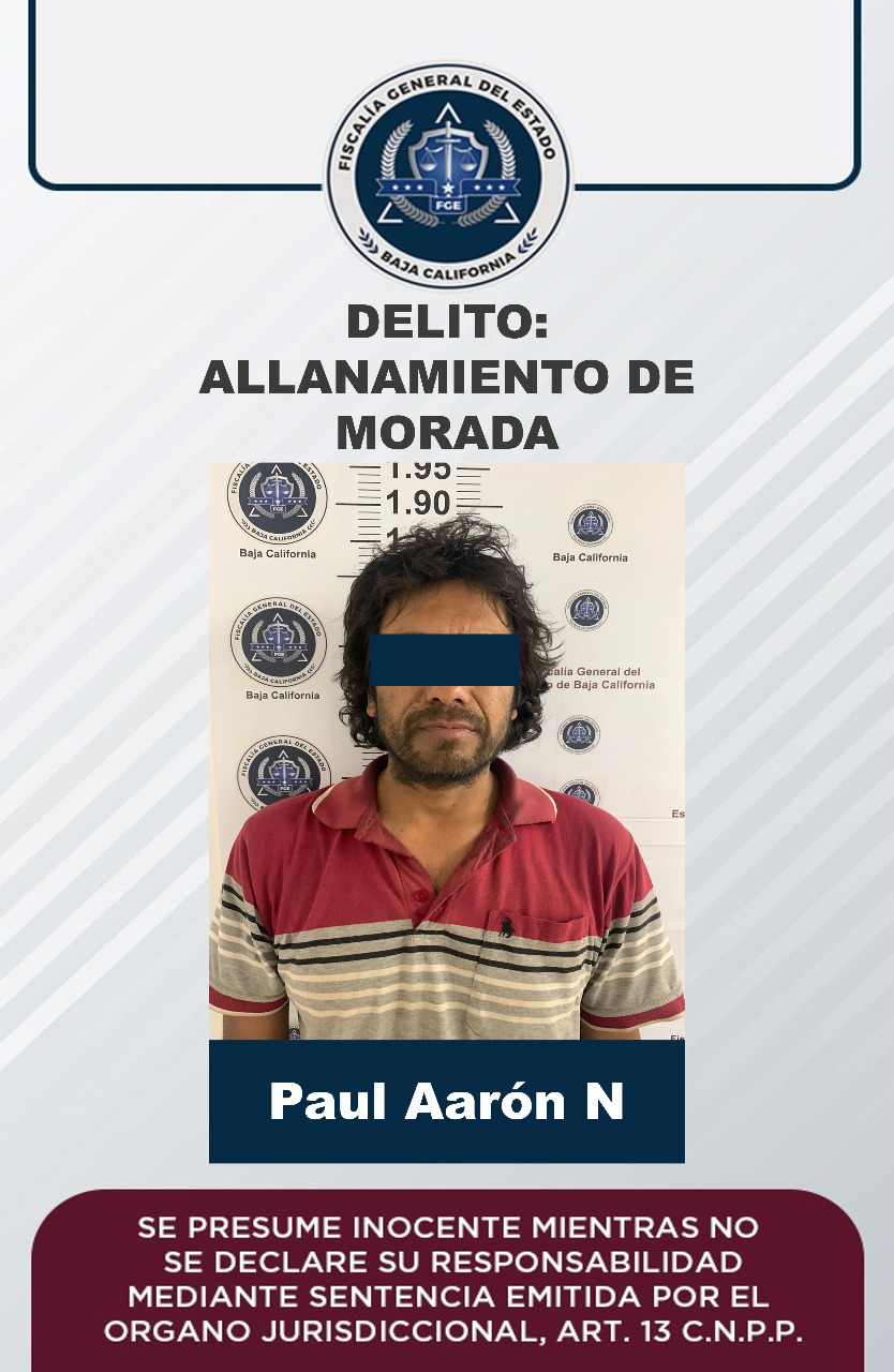 En la colonia Benito Juárez de Playas de Rosarito, la Fiscalía General del Estado cumplimentó una orden de aprehensión en contra de Paul Aarón “N”, acusado del delito de allanamiento de morada.