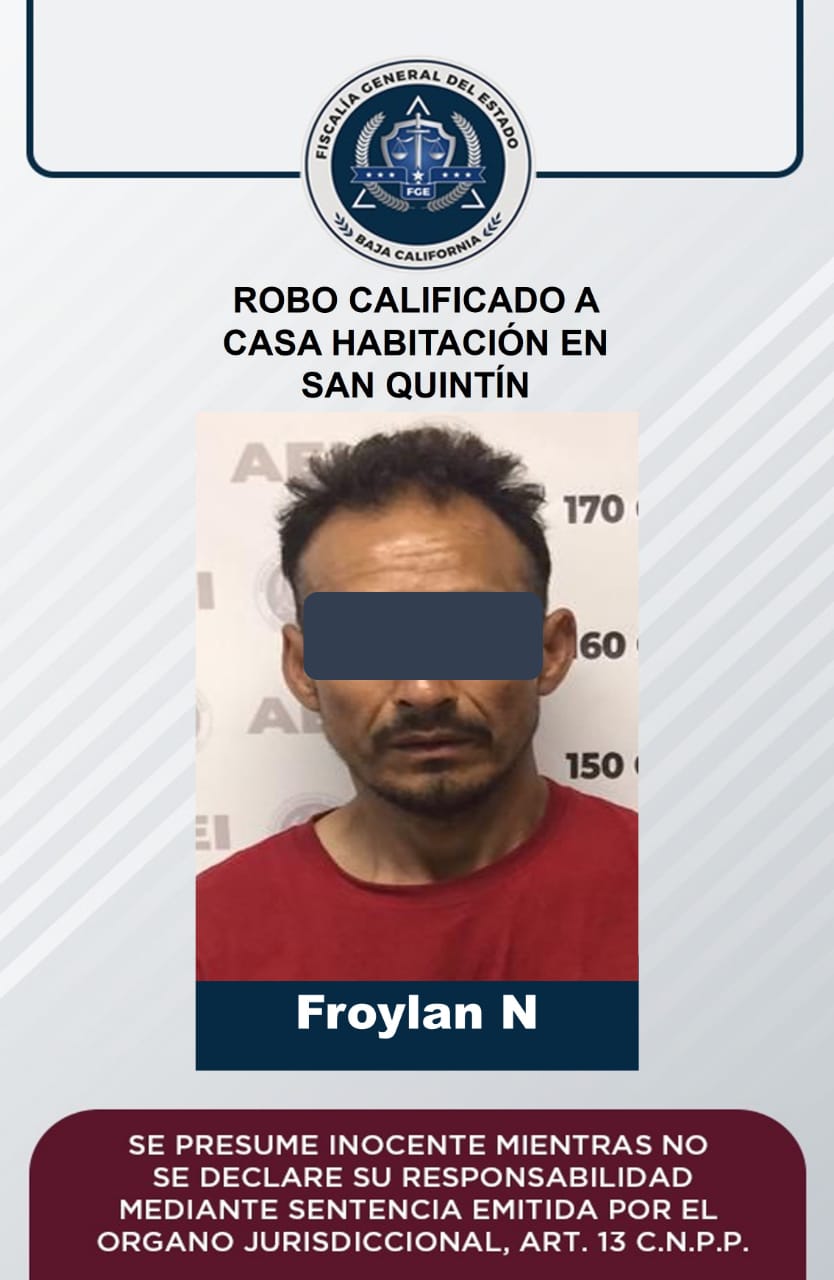 La Fiscalía Regional de San Quintín obtuvo auto de vinculación a proceso penal y medida cautelar de prisión preventiva oficiosa contra Froylan “N”, por el delito de robo calificado a casa habitación.