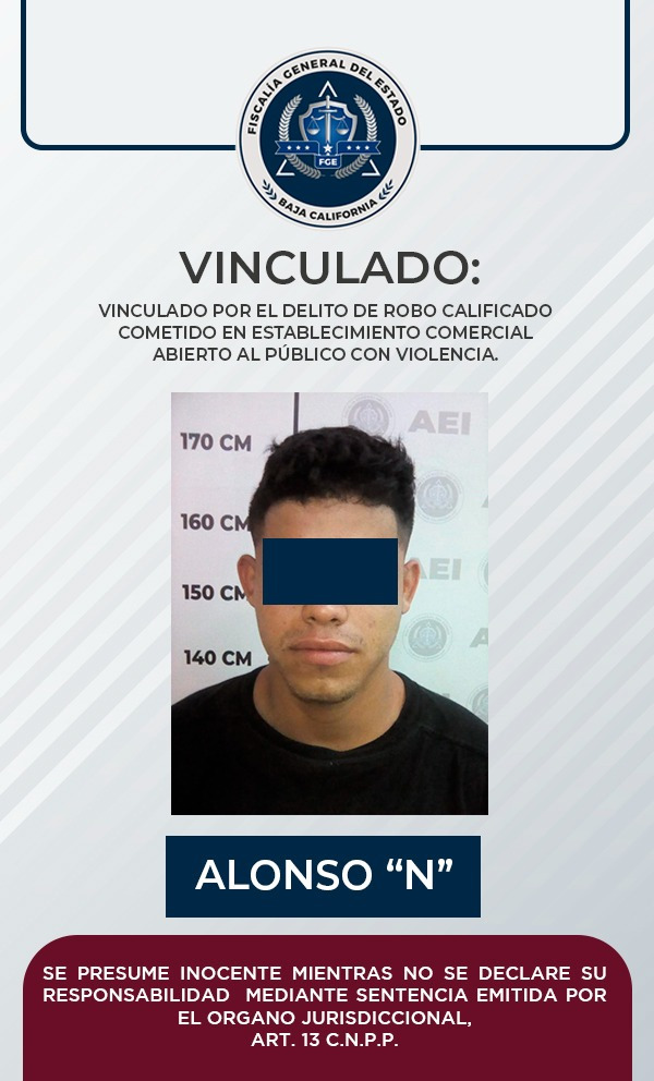 La Fiscalía Regional de Mexicali a través de la Unidad de Investigación con Detenidos Oriente, obtuvo la vinculación a proceso en contra de un joven que participó en el robo con violencia perpetrado el fin de semana en un restaurante de la zona dorada.