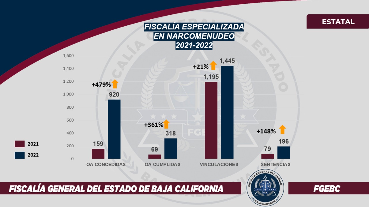 Informó que, de acuerdo a una comparativa entre los años 2021 y 2022, en el periodo de enero al 2 de agosto, la Fiscalía Especializada en Narcomenudeo, con el mismo personal y un plan de trabajo fortalecido, obtuvo este año un 479% más en órdenes de aprehensión, con un total de 920.