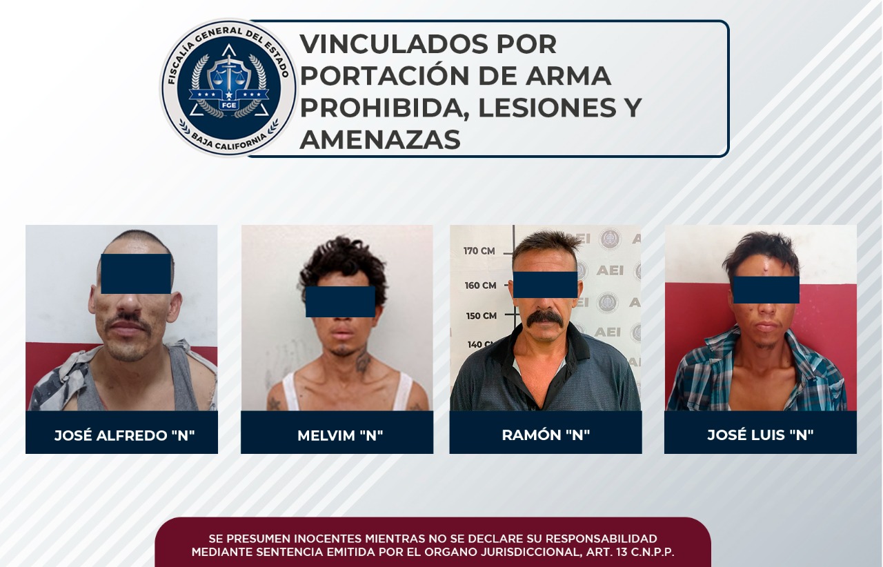 La Fiscalía Regional de Mexicali, a través de las Unidades de Investigación con Detenidos Poniente y Oriente, logró en audiencias por separado la vinculación de acusados por los delitos de portación de arma prohibida, lesiones simples y amenazas.