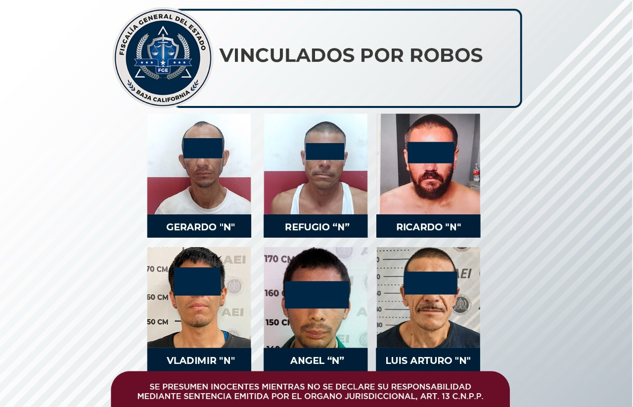 La Fiscalía Regional de Mexicali a través de las Unidades de Investigación de Robos Poniente, Detenidos Poniente y Oriente, logró vincular a proceso a seis hombres relacionados en delitos de robos.