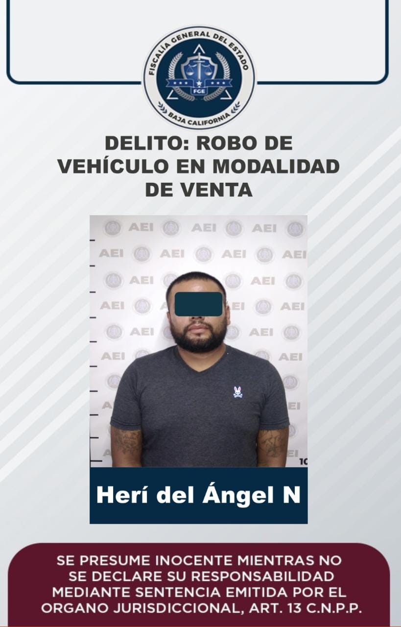 Por el delito de robo de vehículo de motor en modalidad de venta, agentes de la Fiscalía General del Estado cumplimentaron una orden de aprehensión a Herí del Ángel “N”, de 25 años de edad.