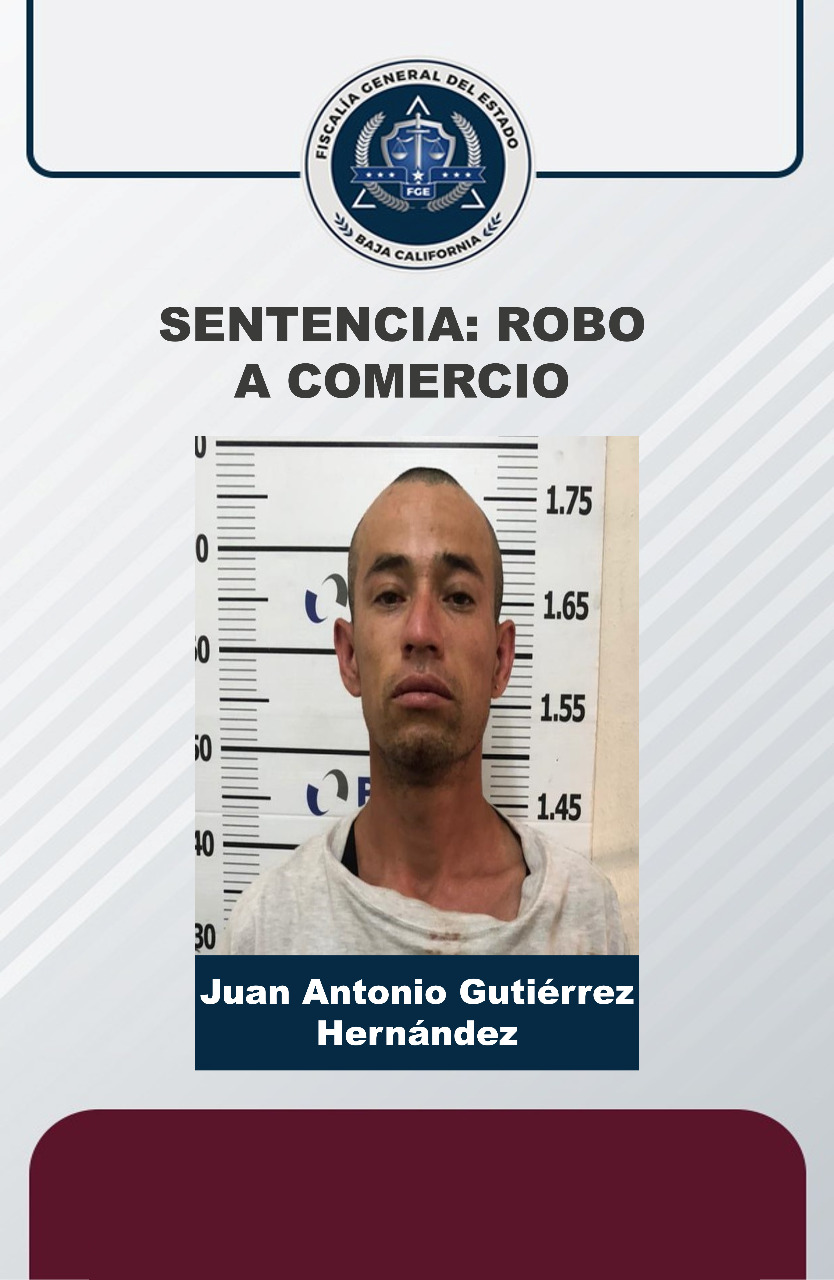La Fiscalía General del Estado obtuvo una sentencia de 6 años de prisión para Juan Antonio Gutiérrez Hernández, culpable del delito de robo calificado cometido en establecimiento comercial abierto al público cometido por una persona armada.