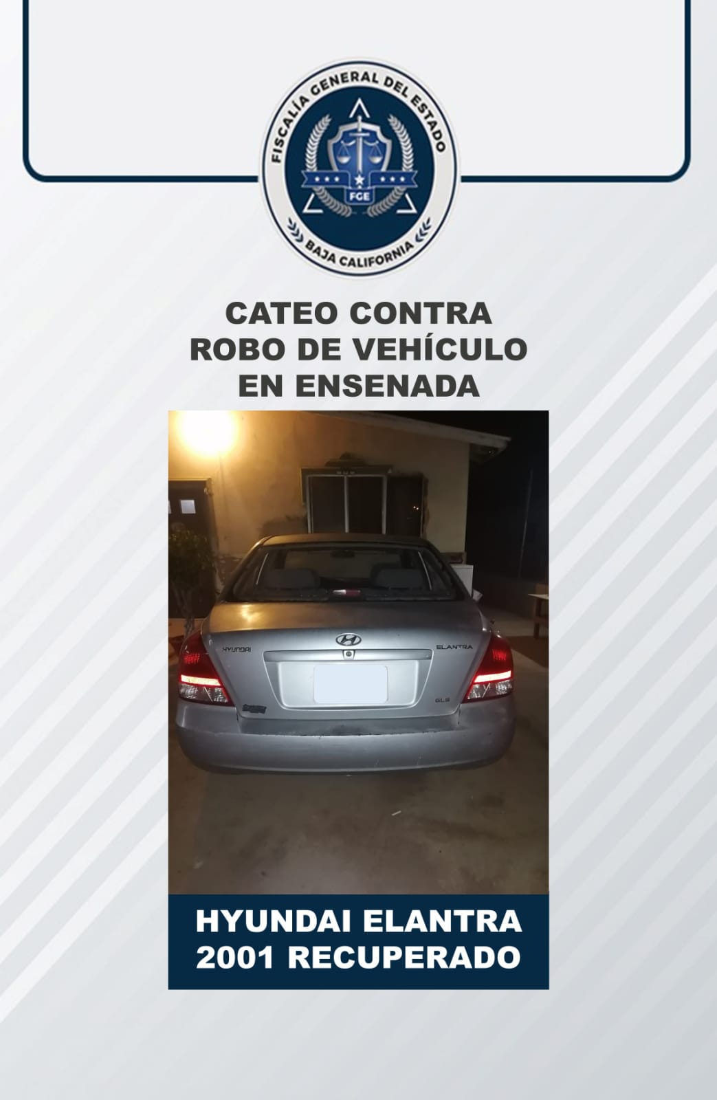 Durante un cateo ejecutado por agentes de la Unidad de Investigación de Robo de Vehículo de la Fiscalía Regional de Ensenada, se aseguró un sedán Hyundai que contaba con reporte de robo.
