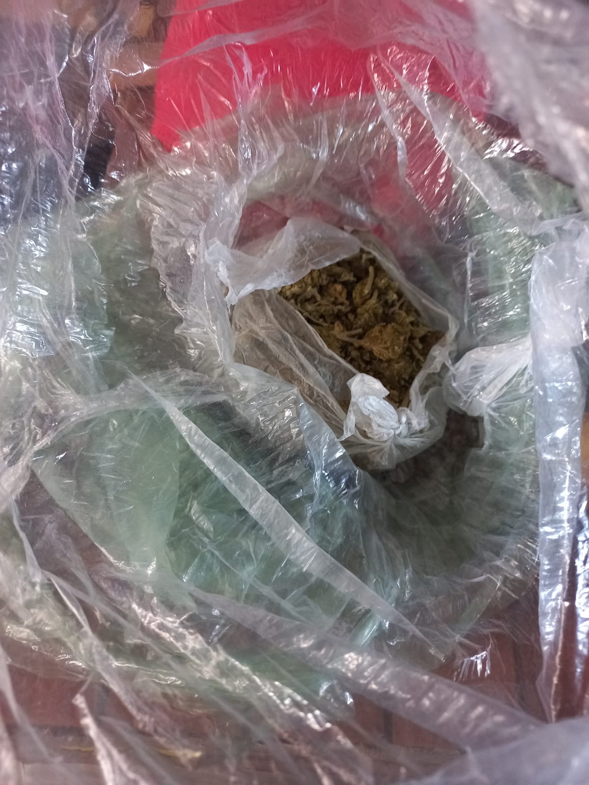 Asimismo, se decomisó una bolsa de plástico transparente cerrada con nudo, conteniendo una hierba seca color verde con características de marihuana y 13 envoltorios de plástico transparente cerrados al calor, conteniendo una sustancia granulada con características de metanfetamina.