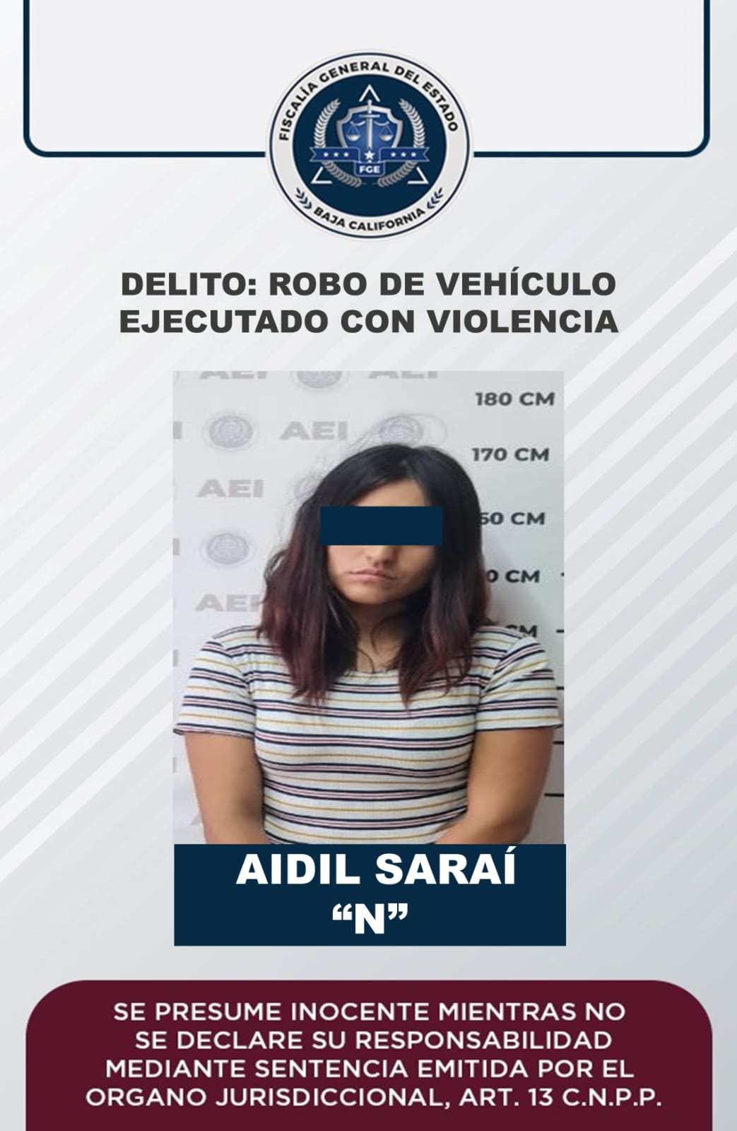 La Fiscalía Regional de Ensenada logró auto de vinculación a proceso y medida cautelar de prisión preventiva contra Aidil Saraí “N”, de 22 años de edad, presunta copartícipe en dos casos por robo con violencia cometidos en perjuicio del conductor de una plataforma digital y un taxista, hechos sucedidos en julio del año en curso.