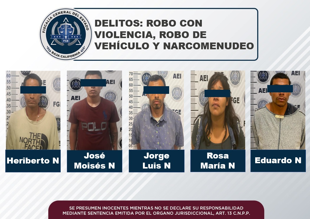 La Fiscalía General de Tijuana, a través de la Agencia Estatal de Investigación, capturó a cinco imputados, cuatro hombres y una mujer, por diversos delitos; contaban con orden de aprehensión en casos por separado.