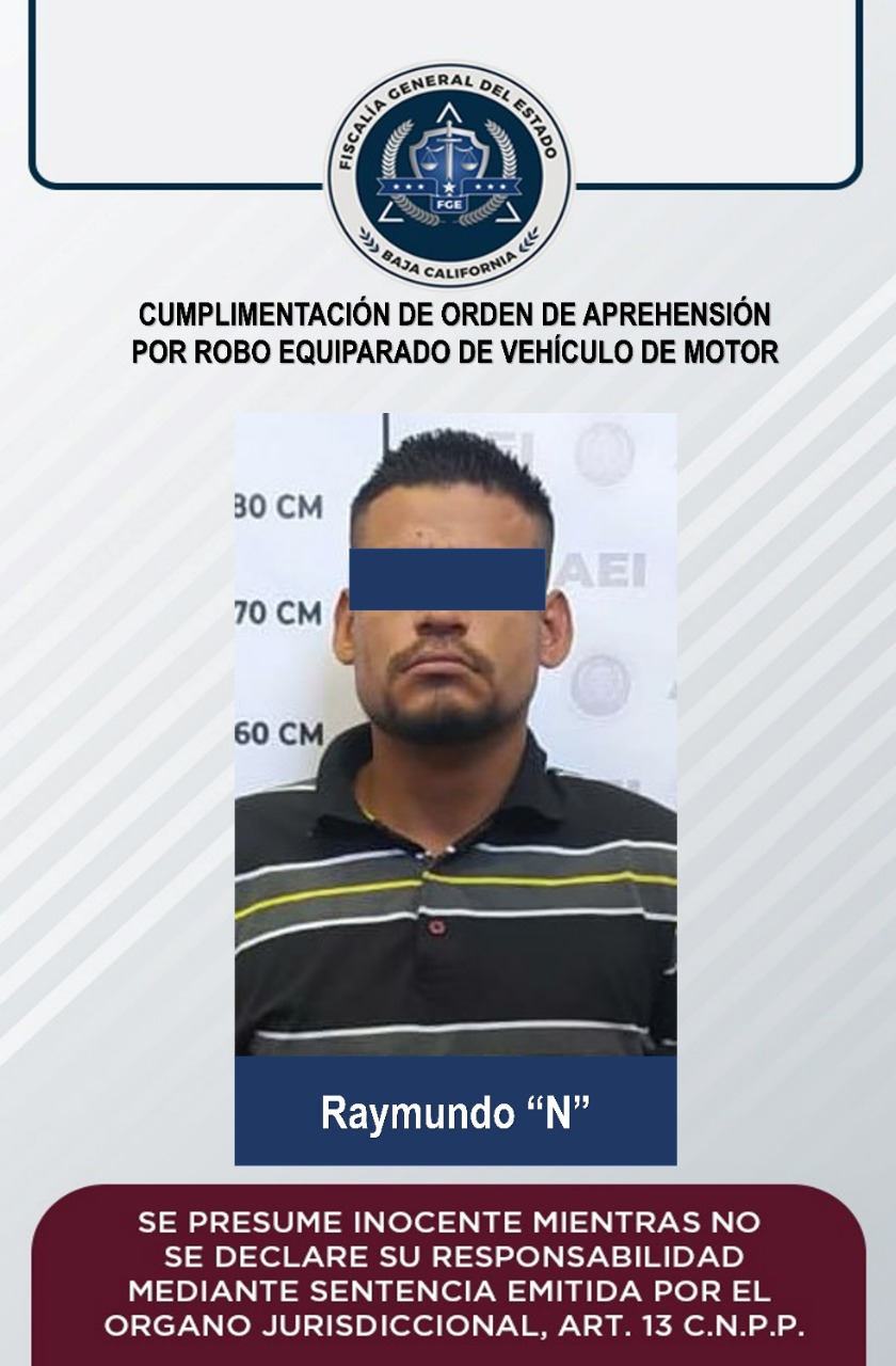 Elementos de la Agencia Estatal de Investigación (AEI) de la Fiscalía Regional de Mexicali capturaron a un sujeto por contar una orden de aprehensión por el delito de robo equiparado de vehículo de motor en su modalidad de uso de vehículo de motor robado.