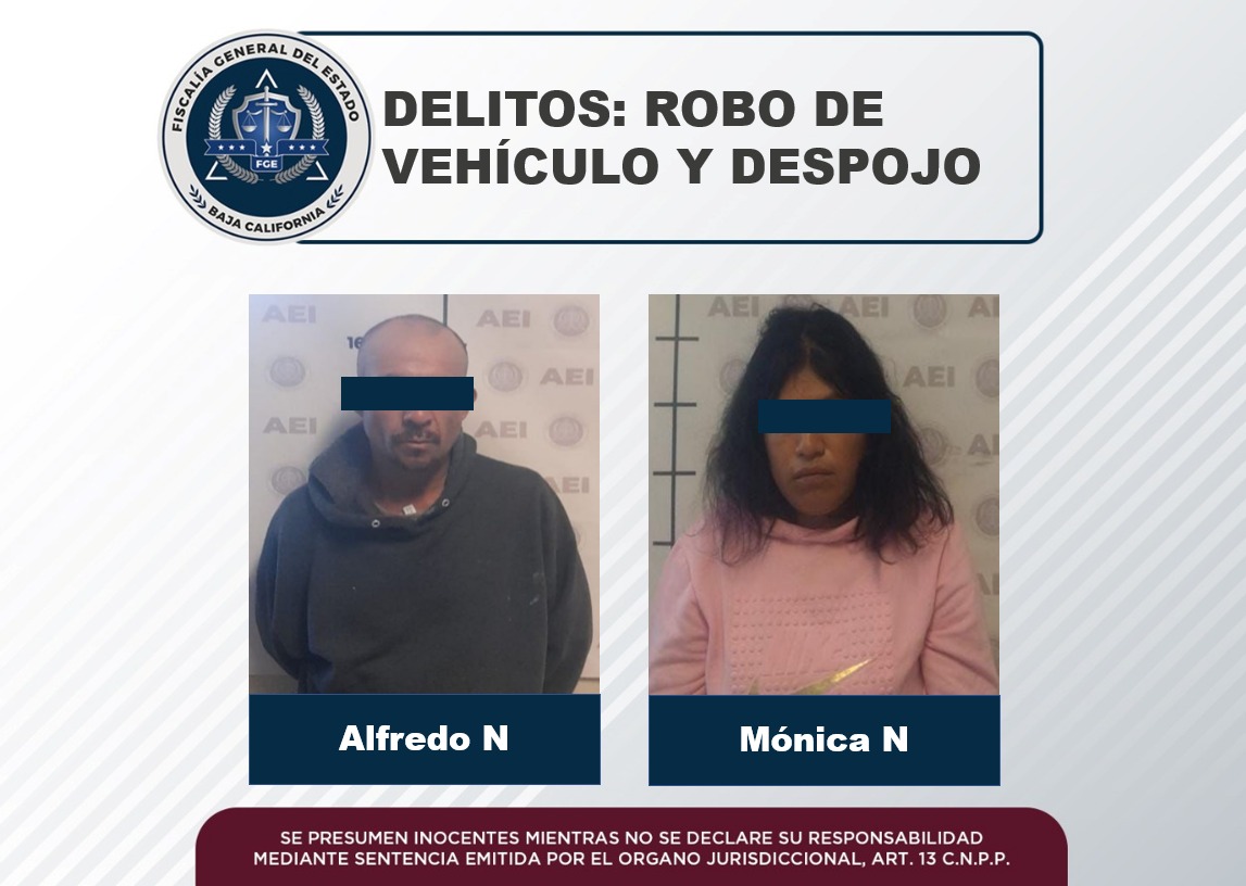 La Fiscalía Regional de Tecate, a través de la Agencia Estatal de Investigación (AEI), logró la captura de un hombre y una mujer, quienes contaban con orden de aprehensión en su contra por los delitos de robo de vehículo y despojo, respectivamente.