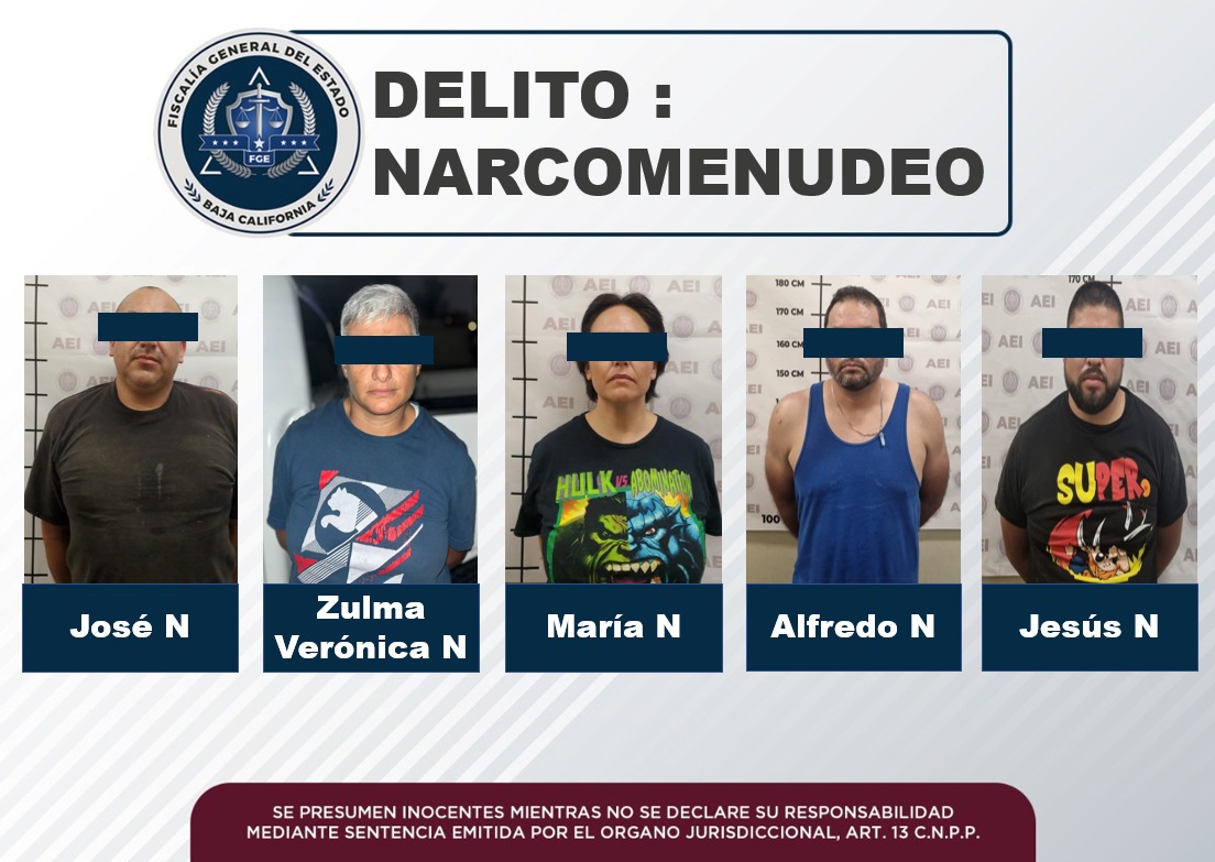 TIJUANA, B.C. - La Fiscalía General del Estado, detuvo a cinco sujetos imputados por delitos contra la salud, durante tres cateos realizados en diversas colonias de la ciudad de Tijuana.