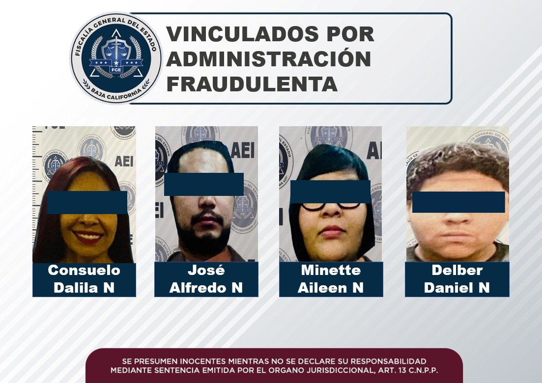 MEXICALI, B. C. - Por el delito de administración fraudulenta, la Fiscalía General del Estado logró vincular a proceso a Consuelo Dalila “N”, Minette Alineen “N”, Delber Daniel” N” y José Alfredo “N”, involucrados en el fraude de la Caja de Ahorro Magisterial A.C., (CMAC).