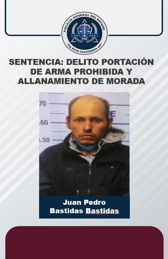 PLAYAS DE ROSARITO, B. C. - Mediante un procedimiento abreviado, el de nombre Juan Pedro Bastidas Bastidas, fue condenado a una pena de un año de prisión por encontrarse culpable de los delitos de portación de arma prohibida y allanamiento de morada.