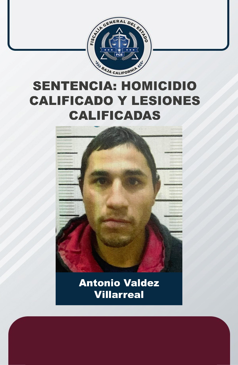 TIJUANA, B.C. - Como resultado de la integración de elementos a la carpeta de investigación por los delitos de homicidio calificado y lesiones calificadas, la Fiscalía General del Estado, a través de la Fiscalía Especializada en Delitos Contra la Vida, acreditó la responsabilidad y participación de Antonio Valdez Villarreal, alias “El Mazapán”, en los hechos ocurridos el 6 de agosto de 2021, por lo que en un procedimiento abreviado fue sentenciado a 22 años de prisión.