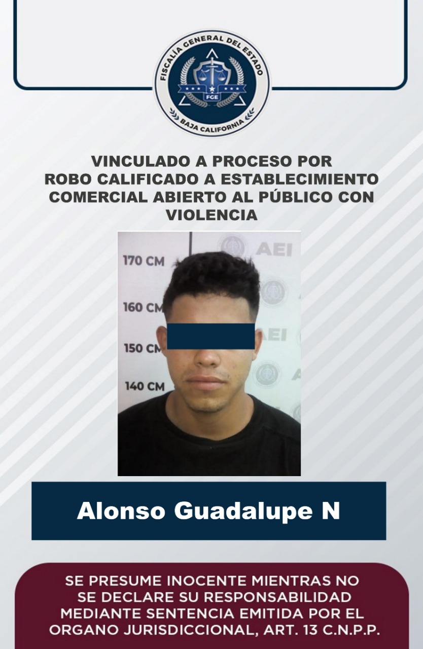 MEXICALI, B. C. - La Fiscalía Regional de Mexicali, a través de la integración de la carpeta de investigación a cargo de la Unidad de Delitos de Robo Poniente, logró la vinculación a proceso de Alonso Guadalupe “N”.